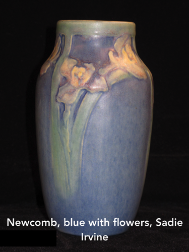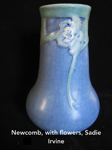 #OR79, dated 1925, shape 214, signed Sadie Irvine, Joseph Meyer potter, 5.50-6" high, matte floral with carved detailing