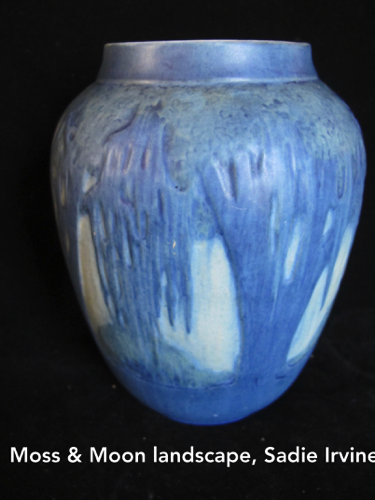 Moss & Moon Landscape, signed Sallie Irvine, potter Jonathan Browne Hunt, circa 1920's, 6.75" high, 6" width